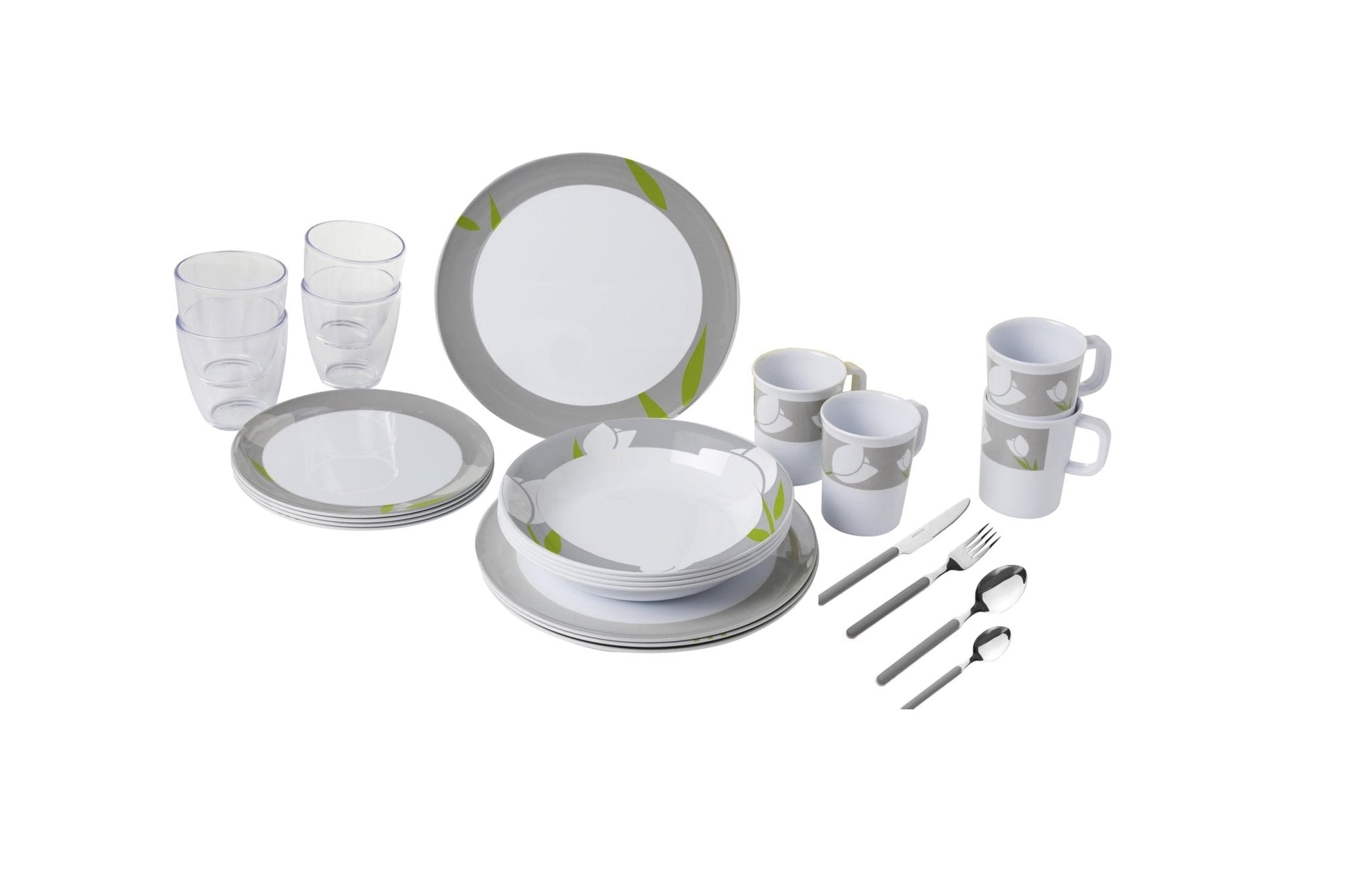 Entdecken Sie unser 36-teiliges Geschirr- und Besteckset, hergestellt aus dem neu entwickelten Melamin/Mineralgemisch. Mit einer harten Oberfläche und Porzellan-Touch bietet es höchste Qualität und Langlebigkeit. Das Set ist lebensmittelecht, leicht zu reinigen und geschmacksneutral. Zudem ist es tiefkühlgeeignet, spülmaschinenfest und bruchfest. Genießen Sie unbeschwerte Mahlzeiten mit diesem vielseitigen Geschirrset.