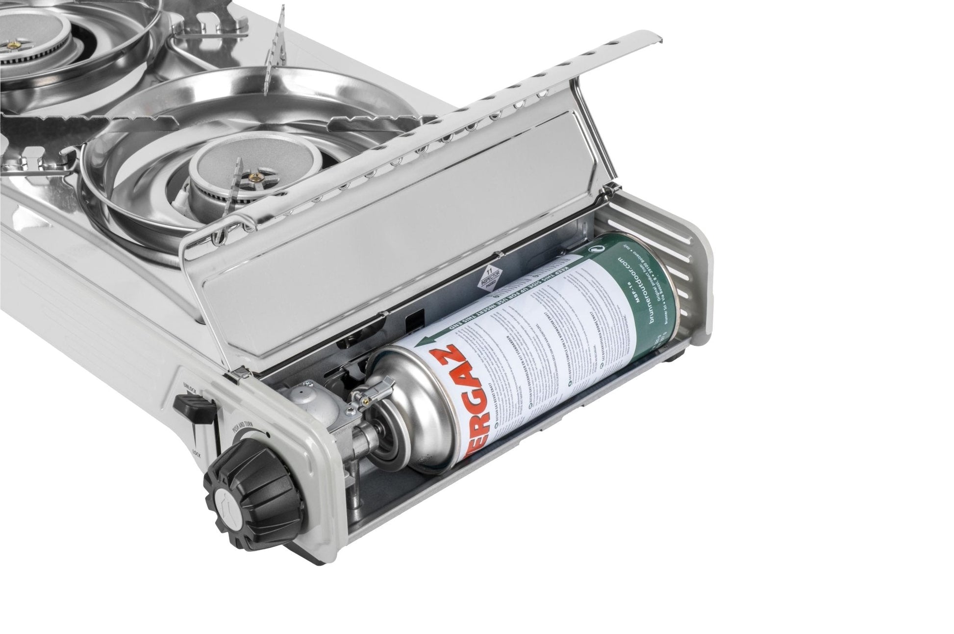 Zweiflammiger Kartuschen-Gaskocher mit Aluguss-Grillplatte. Der Devil Double Gaskocher verfügt über eine Piezo-Zündung und einen Überhitzungsschutz der Gaskartuschen. Der Gaskocher wird in einem praktischen Tragekoffer geliefert ist somit optimal geschützt beim Transportieren und aufbewahren.