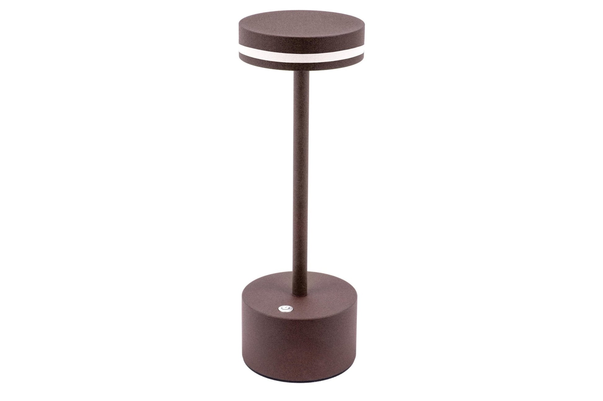 Wiederaufladbare Tischlampe für den Außenbereich mit modernem Design und professionellem Erscheinungsbild. Sie bietet angenehmes Licht dank warmweißer LEDBeleuchtung. Ausgestattet mit einer Lichtstärkeregelung und einem eleganten Metallschirm. Der integrierte Lithium-Ionen-Akku kann jederzeit über das mitgelieferte USB-Kabel wieder aufgeladen werden.