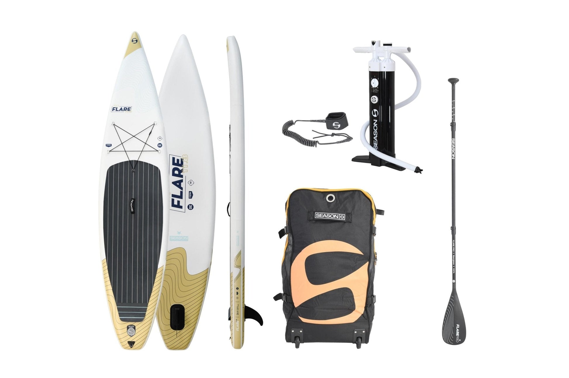 Zur qualitativ hochwertigsten Konstruktion gehört auch hochwertiges Zubehör. So ist die Double Action Pumpe im Lieferumfang enthalten, wie auch das neue Flare Fiberglass Paddel und eine grosse und starke Backpack-Tasche mit Rollen und Aussenfach. Das Flare Pro ist ein echtes Allround Board mit viel Performance. Dank drei möglichen Längen findet Jede und Jeder seine optimale Grösse.
