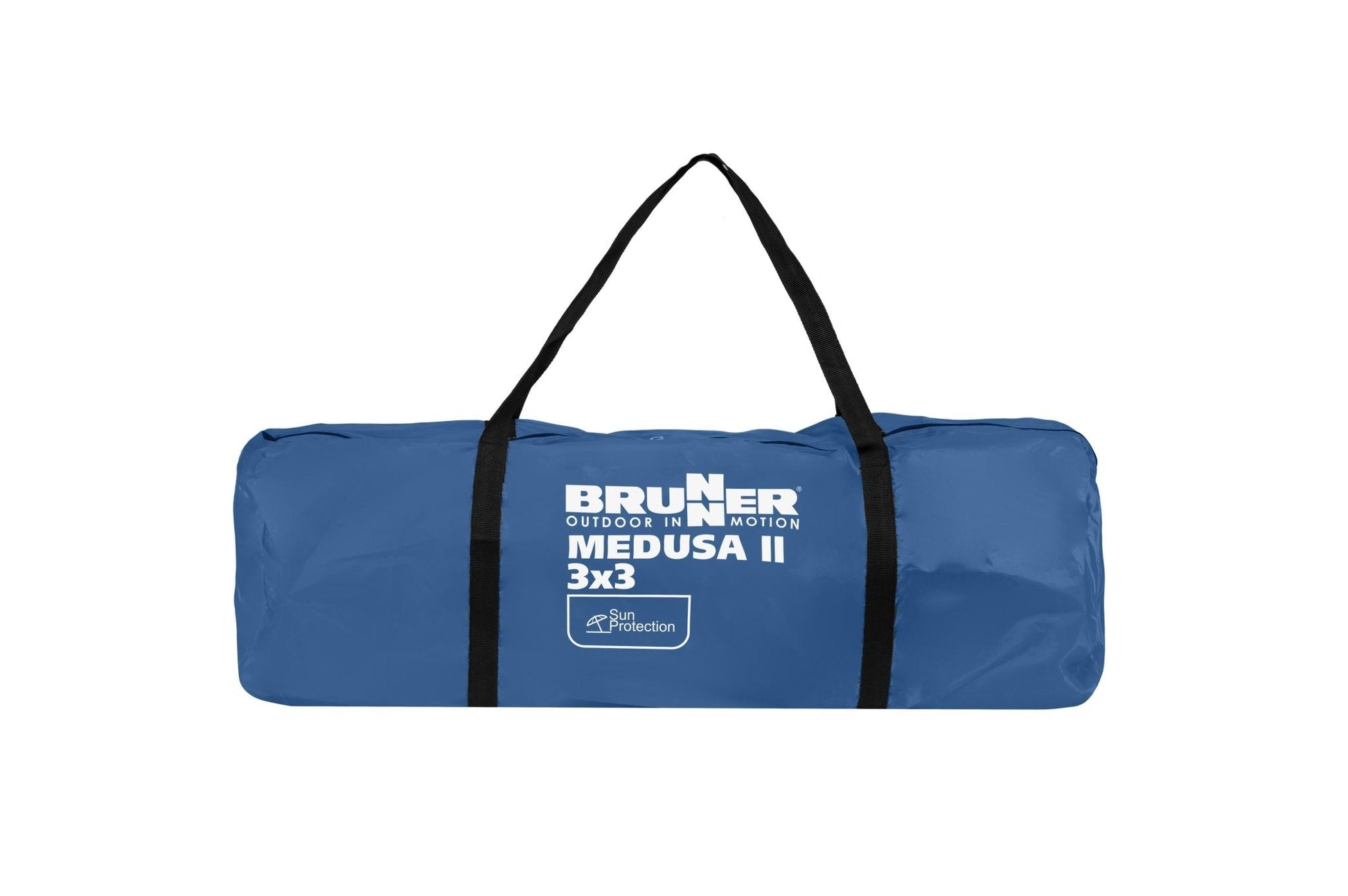 Entdecken Sie den vielseitigen Brunner Medusa II Outdoor-Pavillon in Blau. Mit seinen Bodenmaßen von 3x3 m und der stabilen Konstruktion aus Außen-Stahl- und Fiberglasgestänge bietet er idealen Schutz und Komfort beim Picknick, Campen oder am Strand. Der Pavillon lässt sich schnell und einfach aufbauen und ist mit zwei abnehmbaren Seitenwänden ausgestattet, die Flexibilität bieten. Mit einer Wassersäule von 2000 mm ausgestattet, garantiert er zuverlässigen Schutz vor Regen. Im Lieferumfang enthalten sind Montagematerial und eine praktische Tragetasche, die den Transport erleichtert. Dieser Pavillon ist der perfekte Begleiter für alle Ihre Outdoor-Abenteuer.
