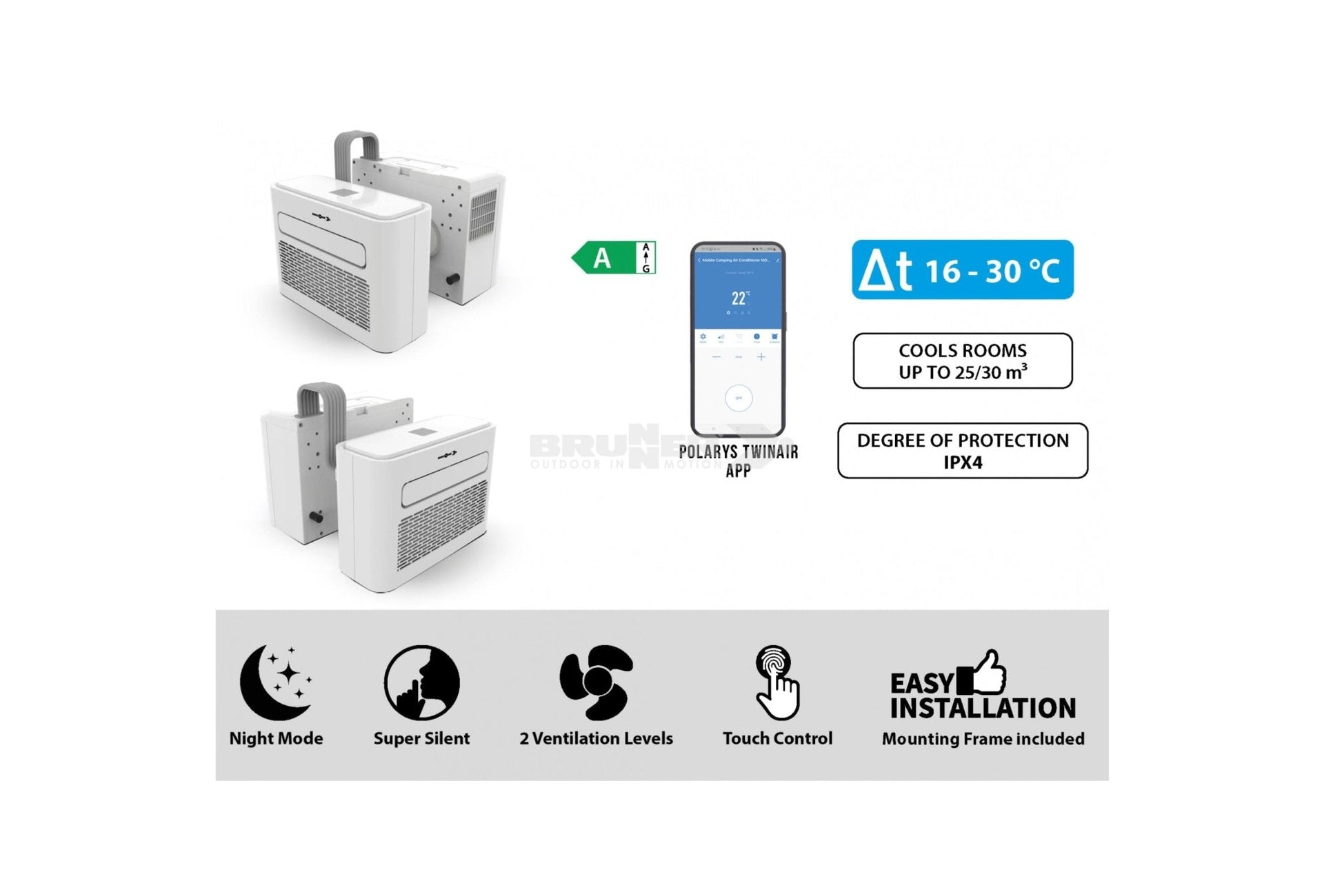 Die Polarys Twinair Split-Klimaanlage bietet eine ideale Lösung für angenehme Kühlung in Ihrem Freizeitfahrzeug. Bestehend aus einem Kondensator für außen und einem Verdampfer für innen, lässt sich die Anlage schnell und einfach installieren. Mit einer Kühlleistung von 3000 BTU (900W) kühlt sie Räume bis zu 30 m³ effizient und verbraucht dabei nur wenig Strom. Zwei Lüftungsstufen und eine App-Steuerung bieten zusätzlichen Komfort. Dank des leisen Betriebs genießen Sie kühle Nächte und entspannte Fahrten, egal wo Sie sind.