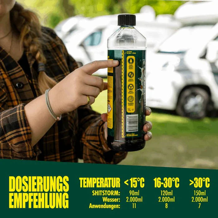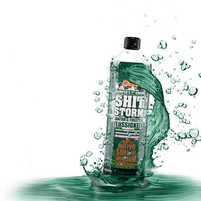 Der SHIT STORM zersetzt Fäkalien und Toilettenpapier zu einer homogenen Flüssigkeit. Er überdeckt Toiletten-Gerüche und maskiert zuverlässig und effektiv mit dunklem Farbstoff. Biologisch abbaubar.