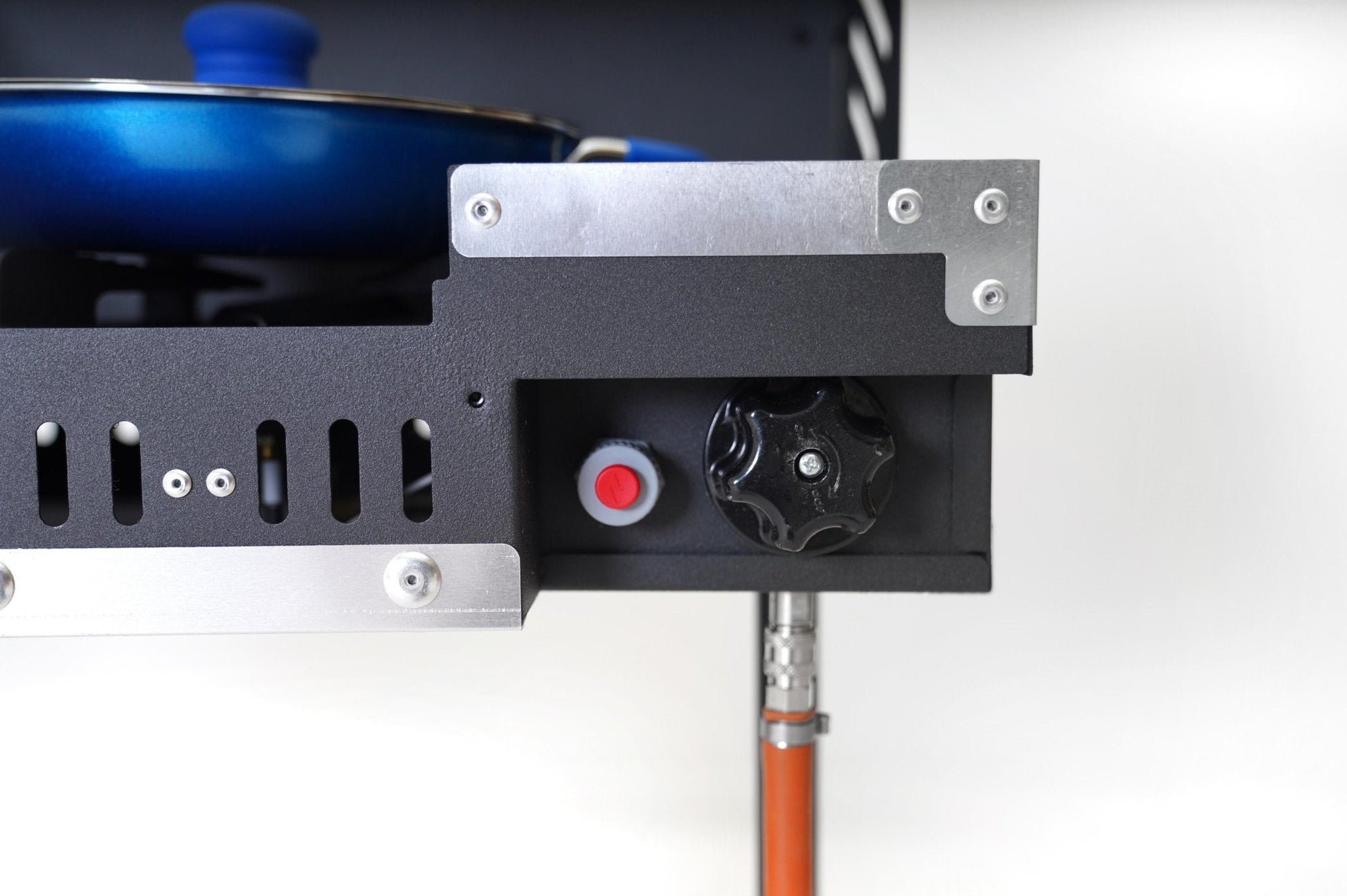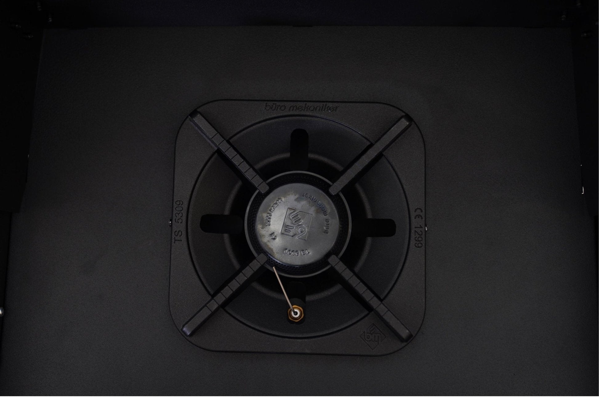 Die Kibo S ist eine faltbare Camping- und Outdoor Küche. Vier abklappbare Beine und zwei zusätzliche Beine zum anschrauben sorgen für einen sicheren Stand der Box. Sie verfügt über eine Gasplatte, eine Arbeitsfläche und einem Abwaschbecken aus Chromstahl inklusive einem Wasserhan. Der Wasserhahn kann mittels einem USB Kabel aufgeladen werden, der mitgelieferte Schlauch kann in einen Behälter mit Wasser gesteckt werden und schon haben Sie fliessend Wasser. Das Chromstahlbecken hat ein Abflussrohr welches wiederum in einen leeren Behälter geführt werden kann. Unter der Arbeitsplatte finden Sie genügend Stauraum für Ihre Küchenartikel. Die Kibo S ist mit Räder und einem verstellbaren Ziehgriff ausgestattet. Durch das sehr leichte Gewicht und dem kleinem Packmass kann die Box sehr gut im Auto verstaut werden. Der Gasanschluss ist mit einer Schnellkupplung vorbereitet. Die Gasleitung und der Druckregler (passend auf die gängigen Gasflaschen) kann bei Bedarf dazubestellt werden. Optional ist auch eine Grillplatte verfügbar. Die Gasflasche ist nicht im Lieferumfang enthalten.