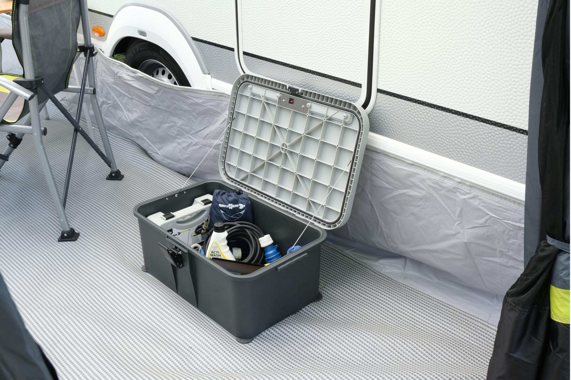 Neu entwickelte Eintrittstufe mit wasserdichtem Innenraum für nützliches Camper-Zubehör wie Werkzeug, Sanitärflüssigkeit, Adapterkabel, usw. Der verschließbare Deckel verfügt über eine rutschfeste Trittfläche und ist zudem mit einem integrierten, solarbetriebenen Sicherheits- und Orientierungslicht ausgestattet. Die hochwertige, sehr stabile Kunststoffkonstruktion verfügt zudem über Drehfüsse zur Niveauregulierung auf unebenem Gelände.