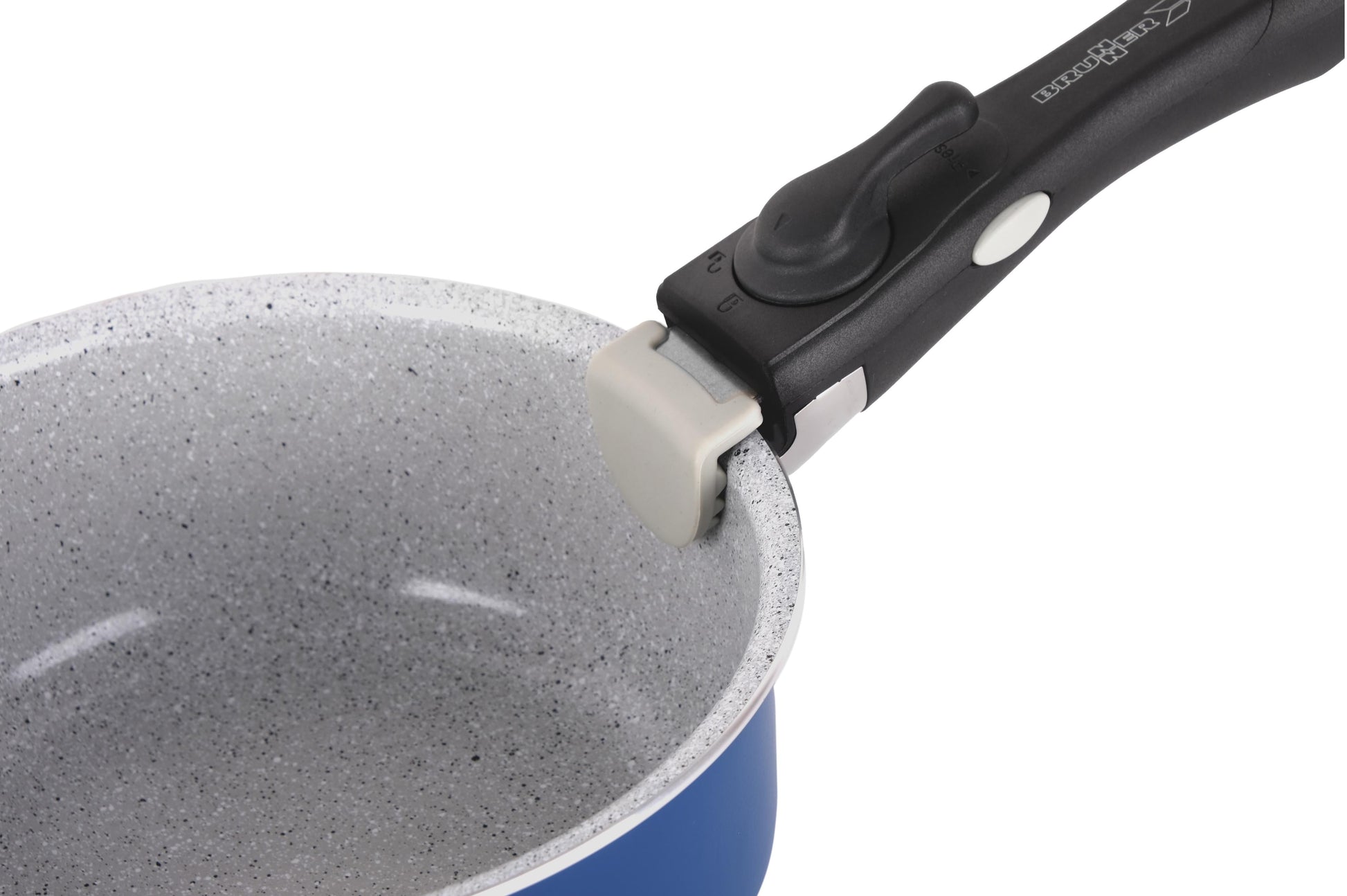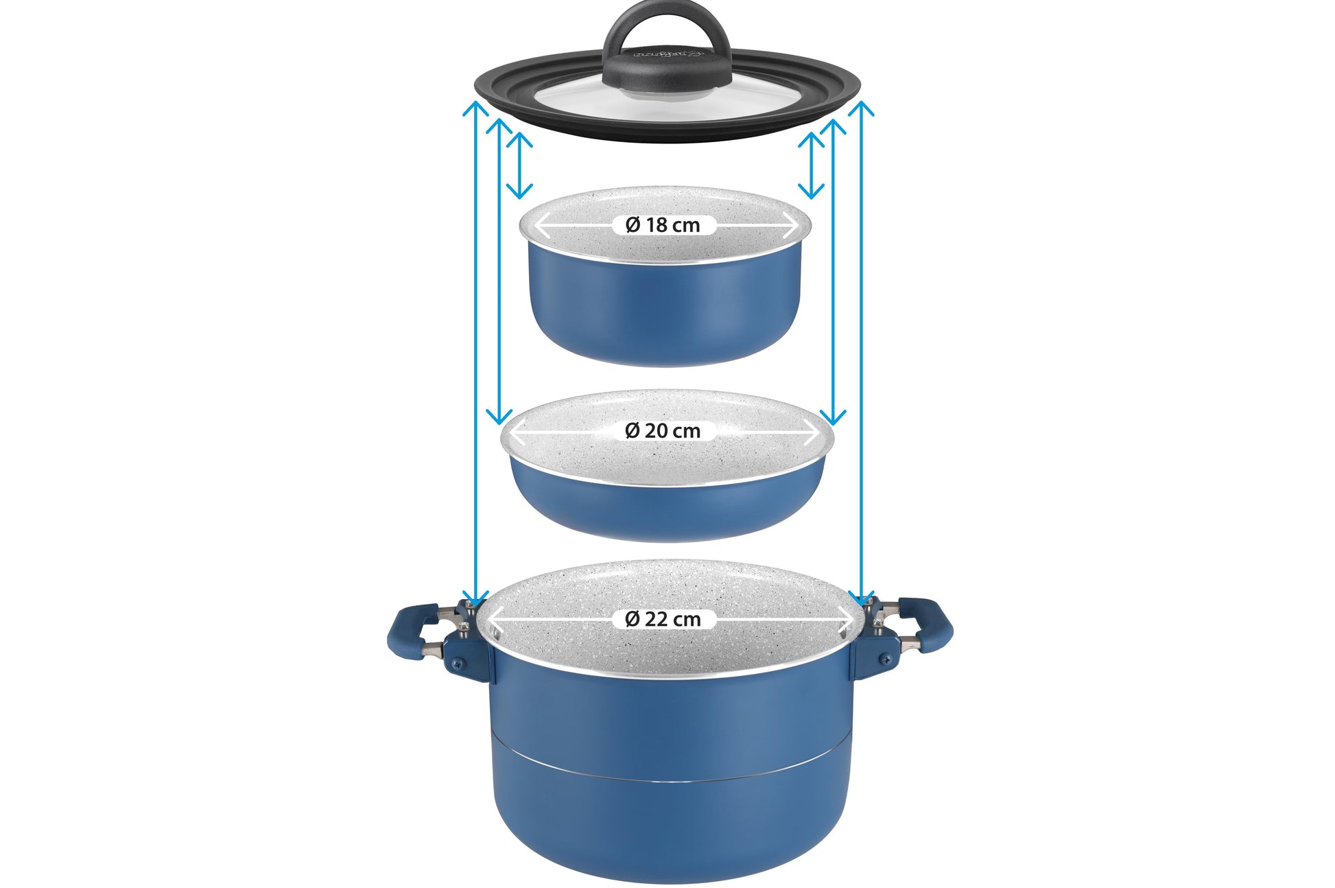 | Inhalt | Kochtopf Ø 22 cm H 14,5 cm, Pfanne Ø 22 cm H 8 cm, Pfanne Ø 20 cm H 5 cm, Kochtopf Ø 18 cm H 8 cm, Glasdeckel Ø 22, Glasdeckel Ø 22 / 20 / 18 cm, 1 Griff |