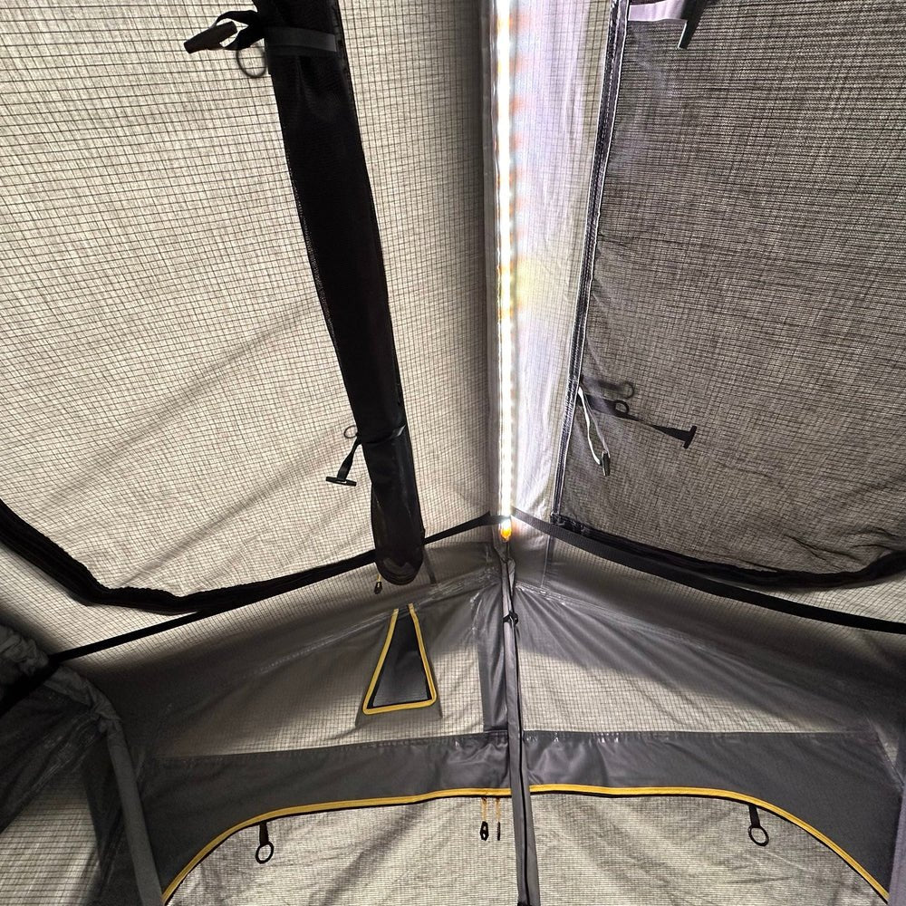 Ambiente im Dachzelt: Die LED-Leuchten sind im Innenraum des Dachzelts integriert und können bequem per dimmbarem Schalter bedient und zwischen drei unterschiedlichen Farbtönen hinundher geschaltet werden.