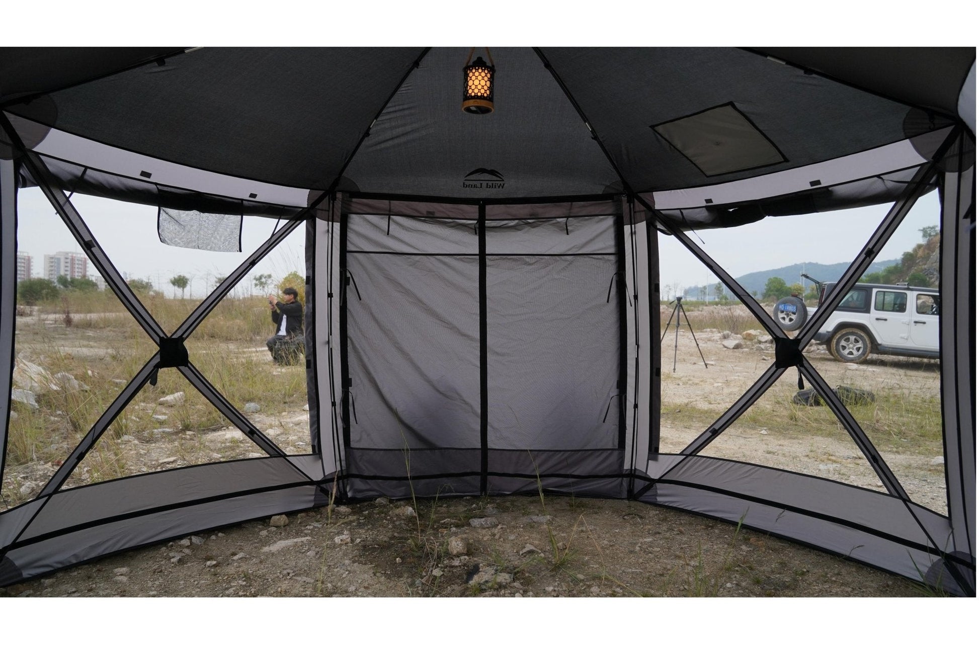 Entdecken Sie das Wild Land Hub Screen House 600 Lux - das ultimative Pop-Up-Gazebo-Zelt! Mit seinem innovativen Nabenmechanismus lässt sich dieses Zelt in weniger als 60 Sekunden aufbauen, für sofortigen Spaß im Freien. Die robusten Mesh-Wände halten Moskitos fern, die T-förmige Tür ermöglicht einfachen Zugang und bietet ausreichend Stehhöhe für Outdoor-Sportveranstaltungen. Unabhängig vom Wetter - dieses Zelt ist Ihr zuverlässiger Begleiter. Das großzügige Platzangebot macht den Wild Land Schutz ideal für eine Vielzahl von Outdoor-Events. Schnell aufgebaut und leicht zu verstauen, ist es mühelos transportierbar und wird in einer strapazierfähigen 600D-Poly-Oxford-Tragetasche geliefert. Bereit für jeden Anlass - überall und jederzeit! Das robuste Nabenmechanismus von Wild Land ermöglicht eine schnelle und einfache Bedienung. Unser Utility-Zelt verfügt über ein neu integriertes Ofenfach im Dach für Outdoor-Kochen und Heizen. Die Seitenvorhänge verbessern die Sicht und Belüftung, können hochgerollt werden und zusammen mit einem optionalen Regenflieger das Zelt wasserfest machen, ideal auch als Überdachung nutzbar. Mehrere Zelte können verbunden und mit unserem Wild Land Autodachzelt kombiniert werden, für ein beeindruckendes Outdoor-Erlebnis.