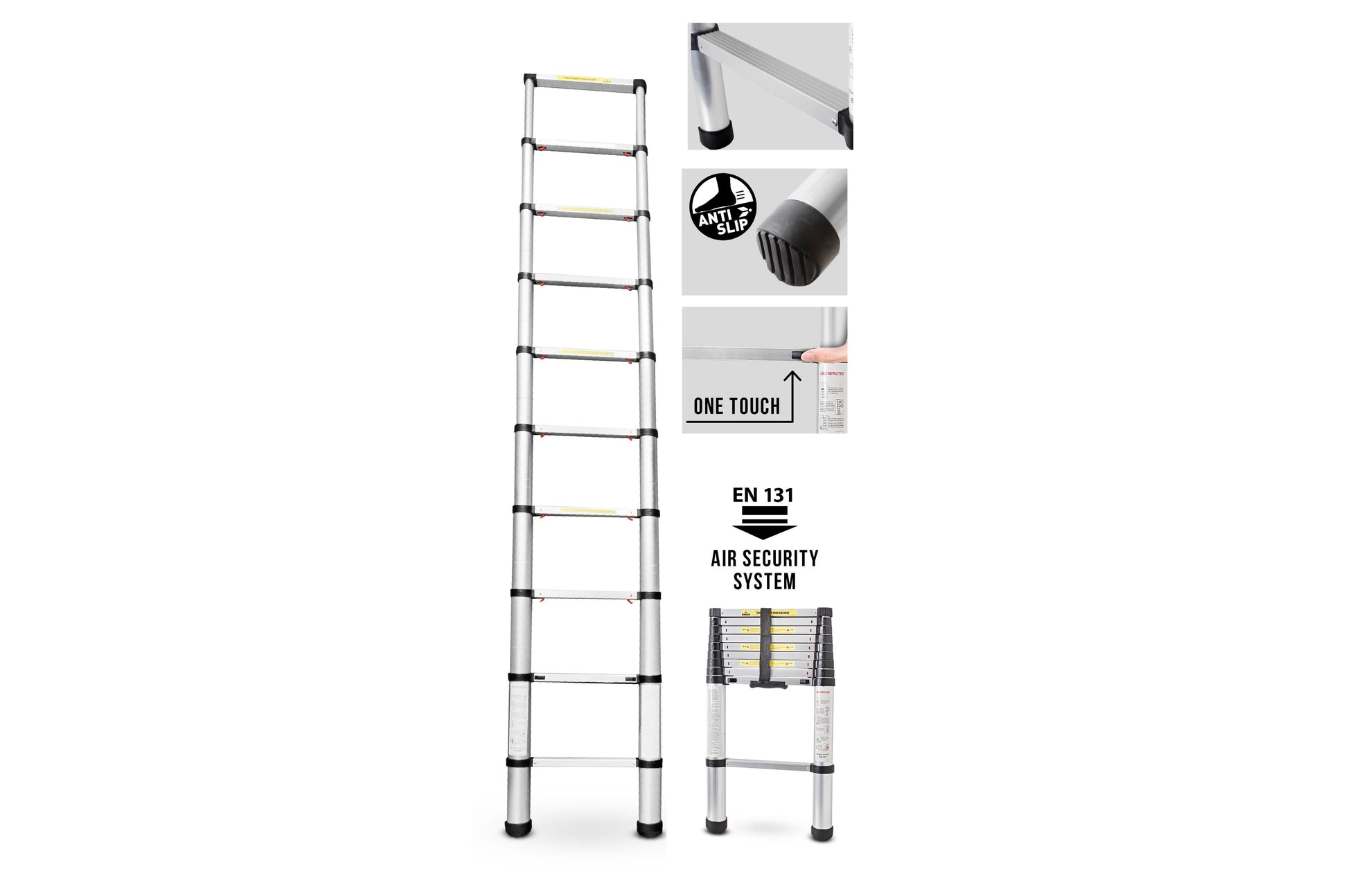 Teleskopierbare Aluminiumleiter mit neu entwickelter luftunterstützter Soft Close-Technologie, die das Risiko von Fingerverletzungen ausschließt. Leicht zu transportieren und höhen- verstellbar. Ausgestattet mit rutschfesten Gummischonern für mehr Sicherheit. Sehr kompakt.