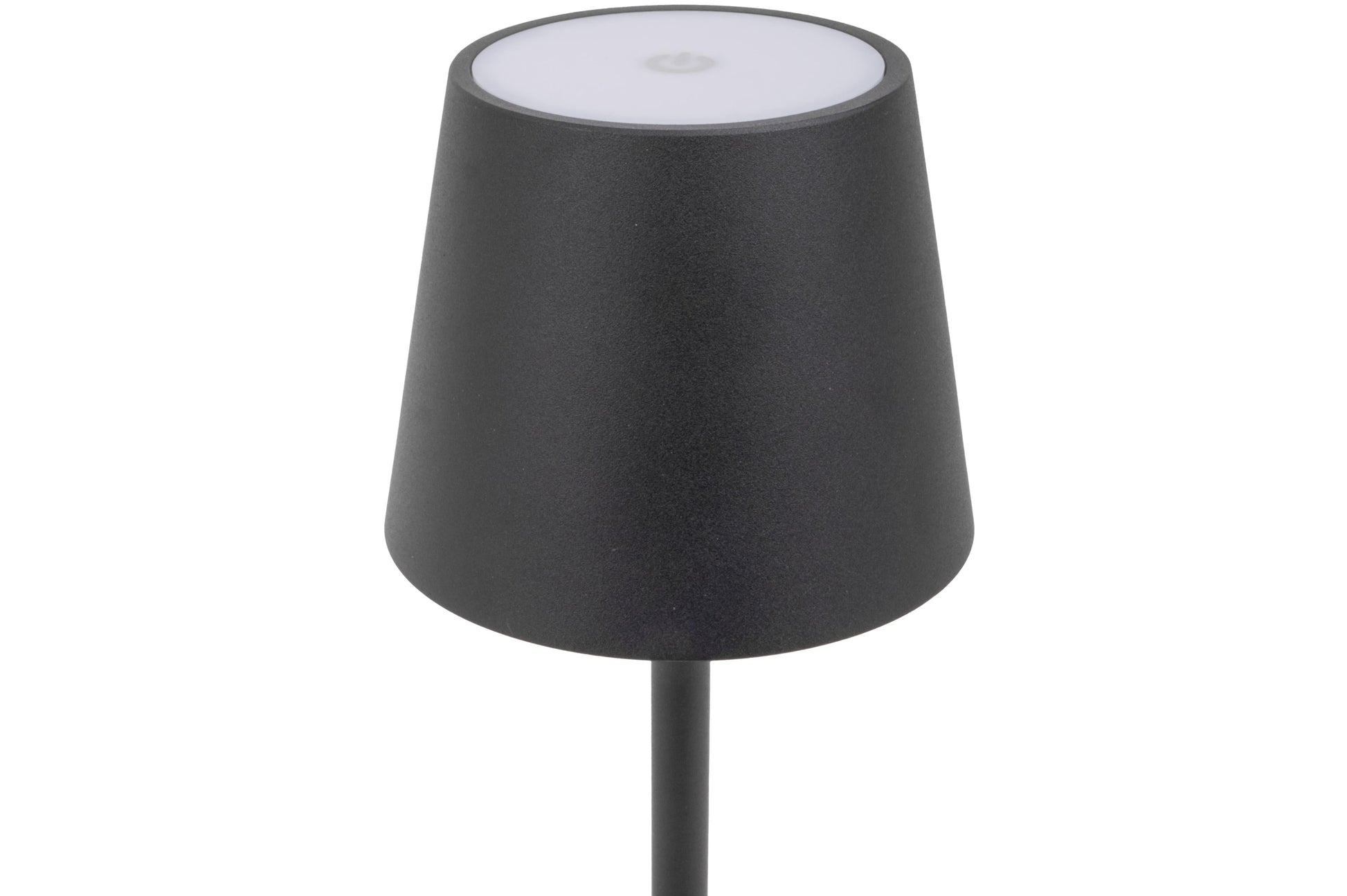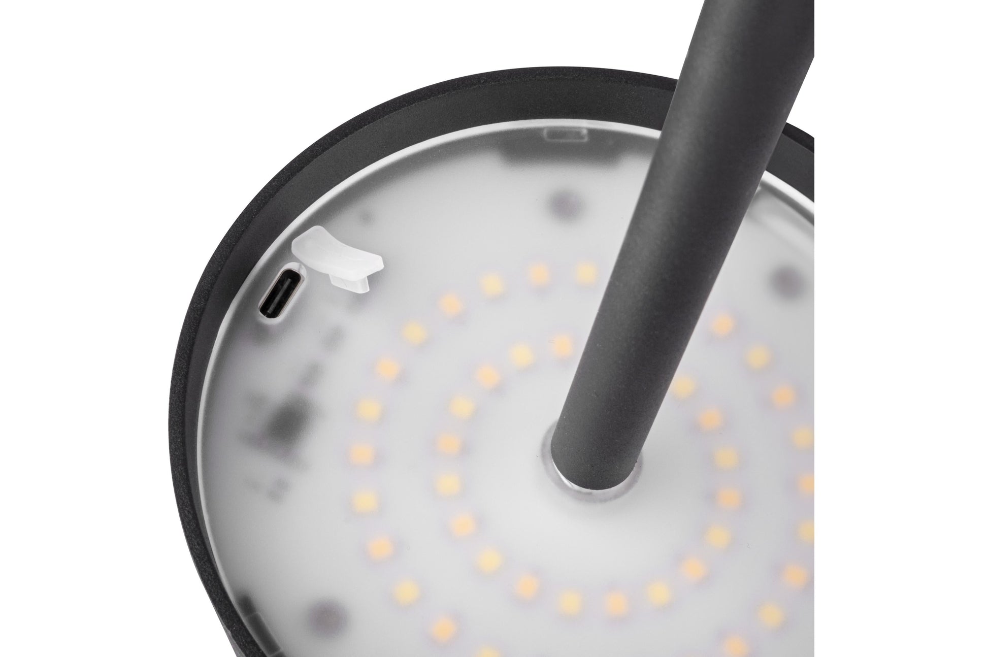 Wiederaufladbare Tischlampe für den Außenbereich mit modernem Design und professionellem Erscheinungsbild. Sie bietet angenehmes Licht dank warmweißer LEDBeleuchtung. Ausgestattet mit einer Lichtstärkeregelung und einem eleganten Metallschirm. Der integrierte Lithium-Ionen-Akku kann jederzeit über das mitgelieferte USB-Kabel wieder aufgeladen werden.