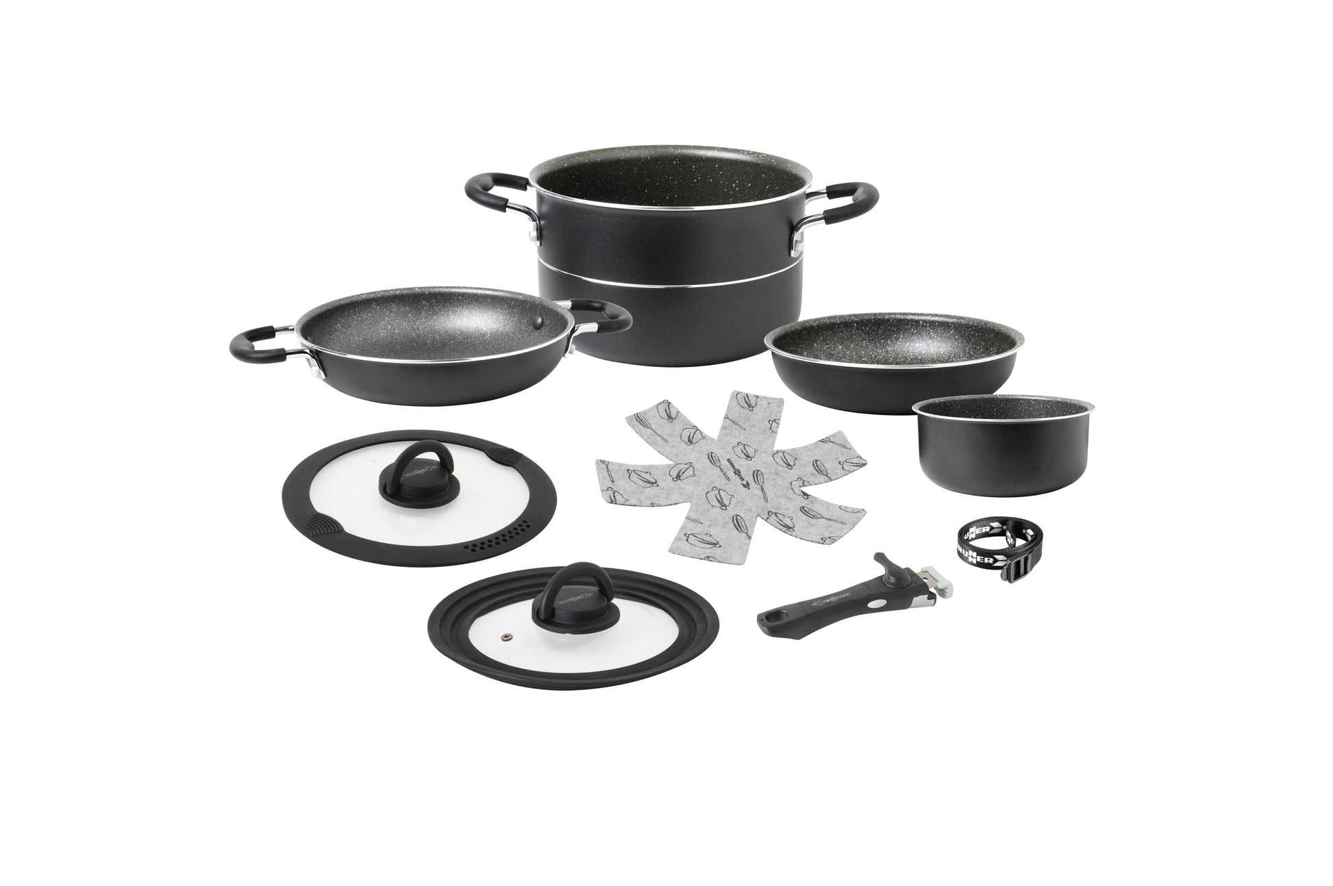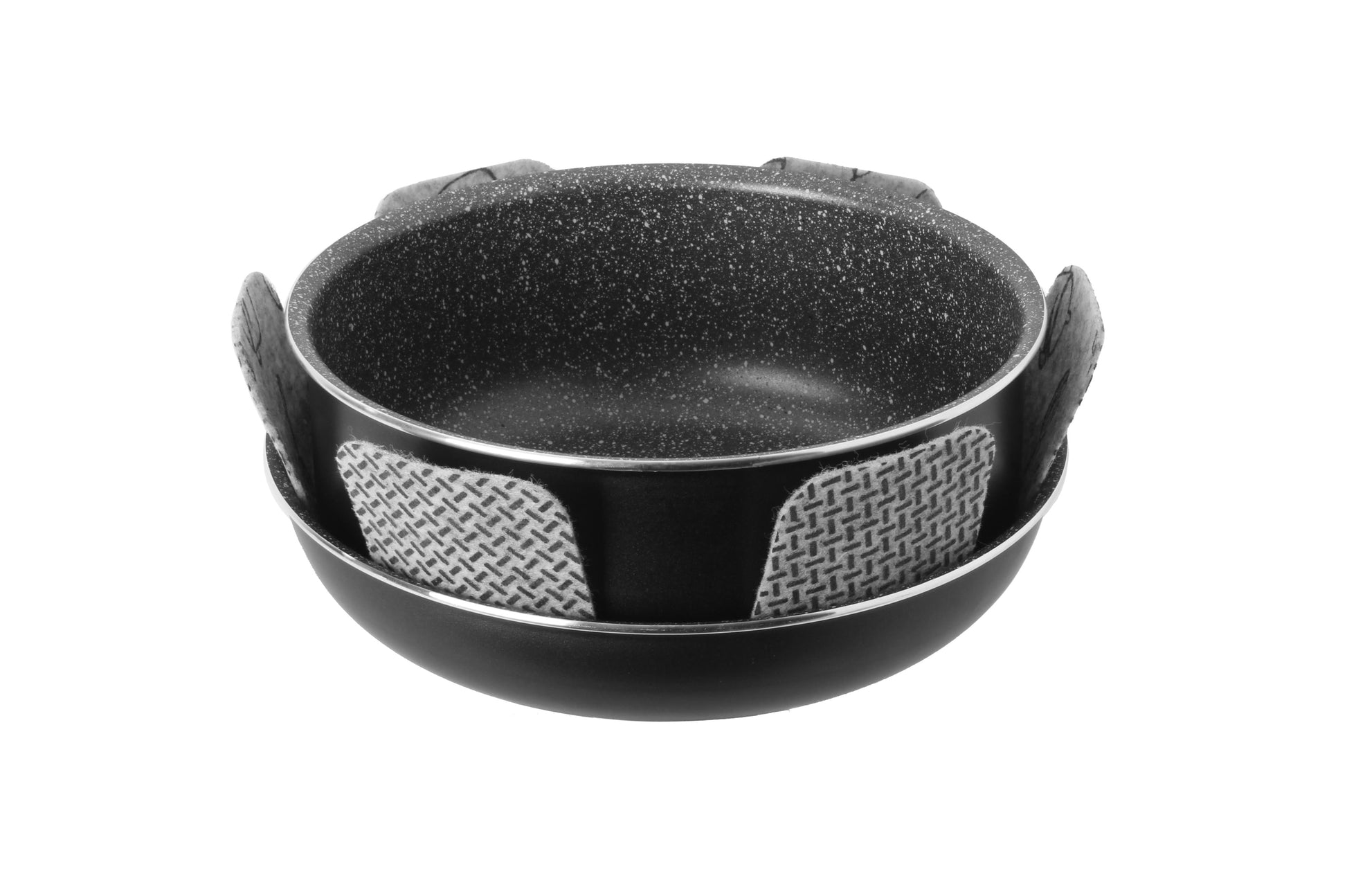 Topfset-Kollektion aus Aluminium mit hochwertiger Antihaft-Beschichtung. Kompakt verstaubar, modernes Design, hygienisch, zuverlässig, unempfindlich gegenüber Temperaturshocks und korrosionsfest. Das neue Vacublock-System sichert Ihre Töpfe und Pfannen während der Fahrt und beweist die herausragende Kreativität unseres Produktentwicklungsteams bei der Entwicklung funktionaler Lösungen für Freizeitfahrzeuge und Boote.