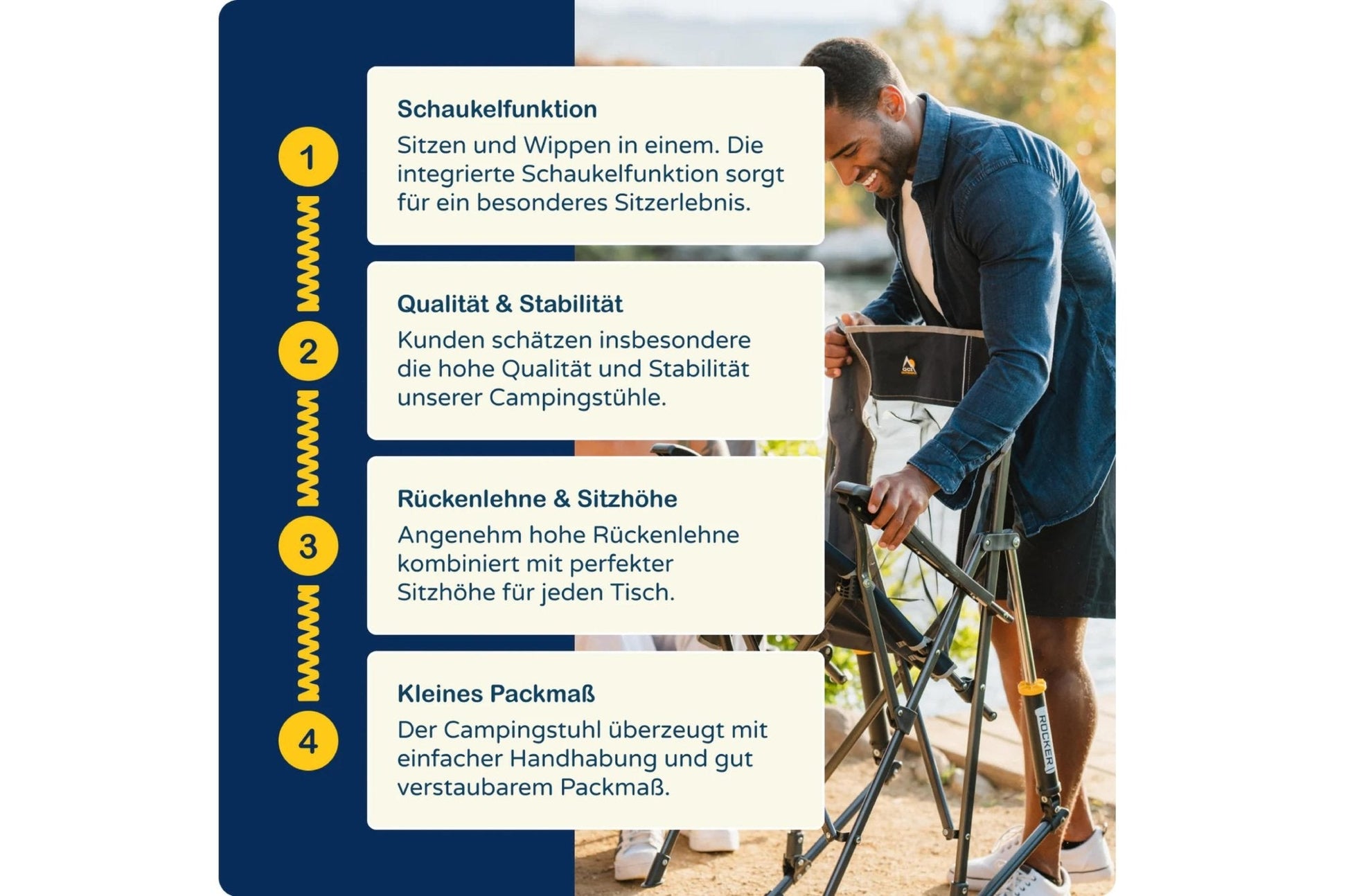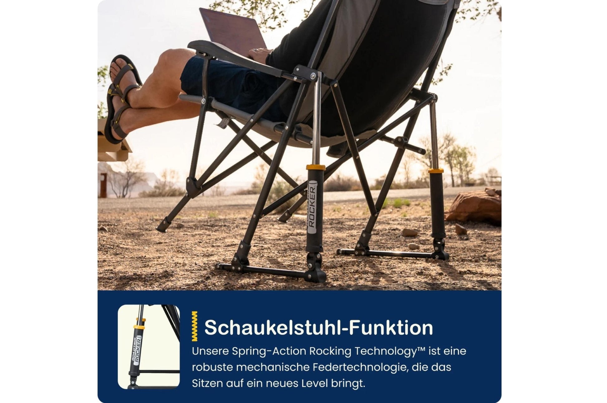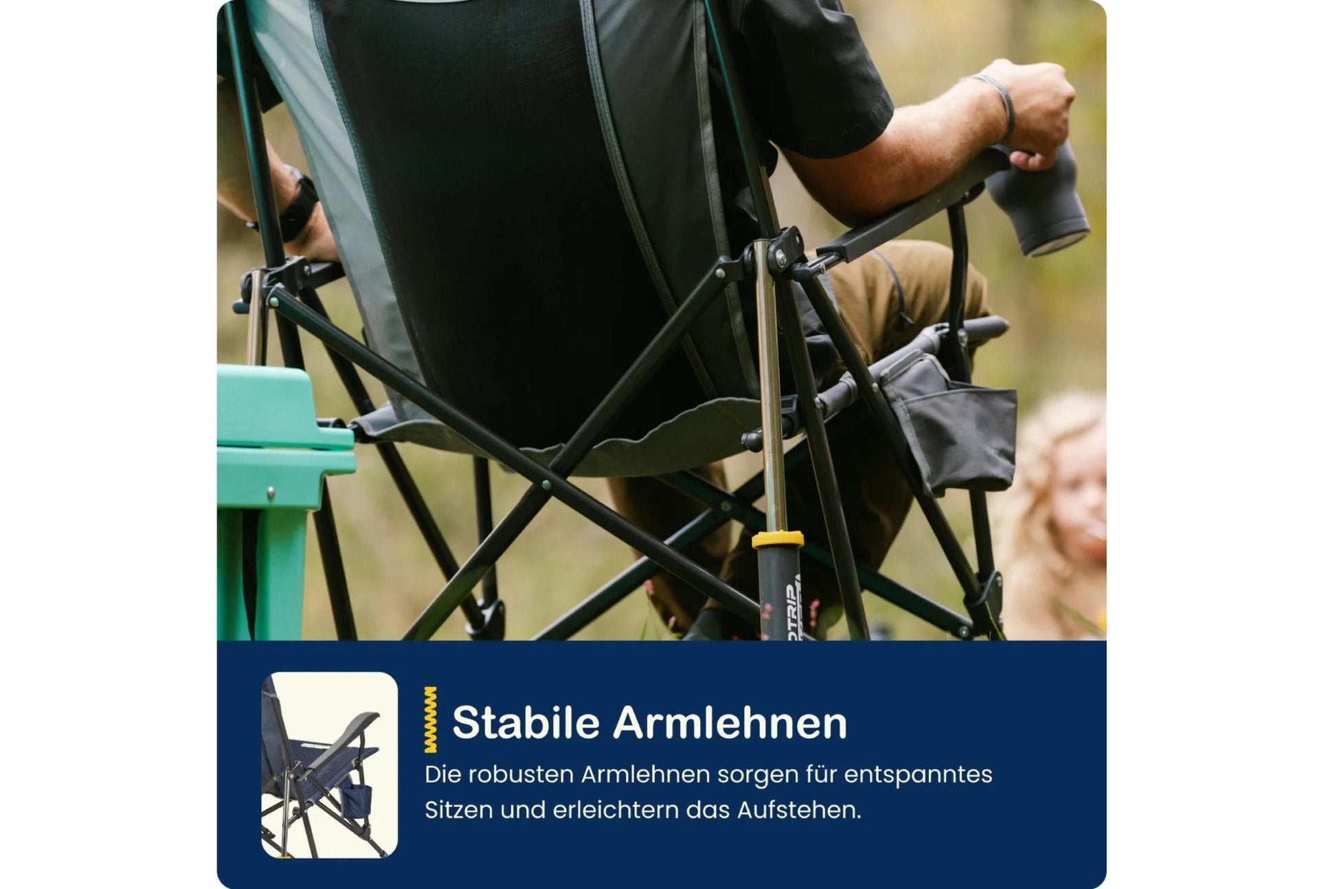 Schaukelstuhl für draußen: Der RoadTrip Rocker mit Faltfunktion. Du suchst nach einem Schaukelstuhl für draußen, der dir Komfort, Innovation und Mobilität bietet? Dann ist der RoadTrip Rocker genau der Richtige für dich. Der RoadTrip Rocker ist ein vollwertiger Schaukelstuhl, der sich mit einem Handgriff zusammenfalten und in einer Tragetasche verstauen lässt. So kannst du ihn überallhin mitnehmen, wo du entspannen möchtest. Ob im Garten, auf dem Campingplatz oder am See, der RoadTrip Rocker ist dein perfekter Begleiter. Er verfügt über die patentierte Spring-Action Rocking Technology™, die dir ein sanftes und angenehmes Schaukelerlebnis ermöglicht. Außerdem hat er solide und stützende Armlehnen und eine luftige Rückenlehne aus Mesh, die dir zusätzlichen Komfort bieten.