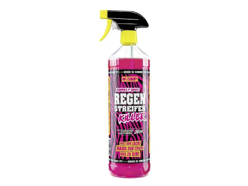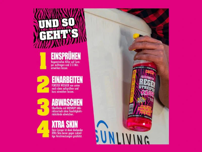 Der REGENSTREIFEN KILLER beseitigt Regenstreifen, Gummireste, Feinstaub, sowie ölige und fettige Verschmutzungen von der Außenhaut. Auch er kommt mit unserem XTRA Skin Effekt.